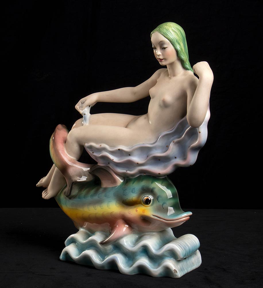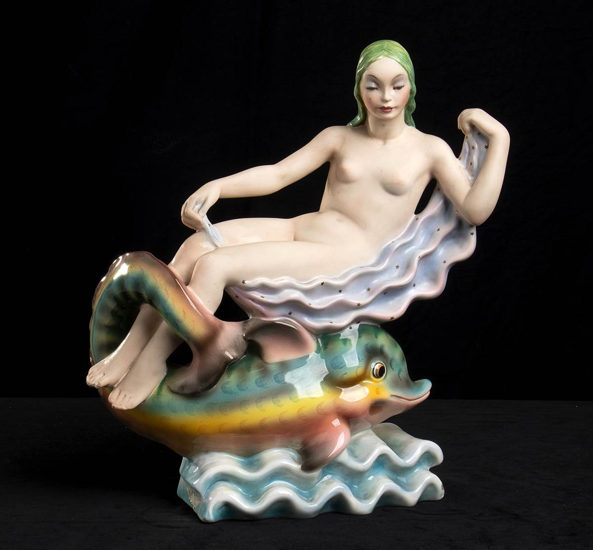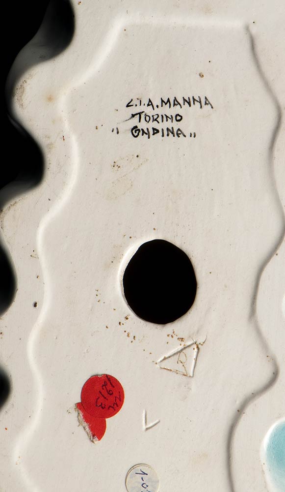 Earthenware sculpture shaped as slip casting. Polychrome decoration. Brand on the base “ CIA MANNA TORINO “ONDINA” LR INCUSSE.”