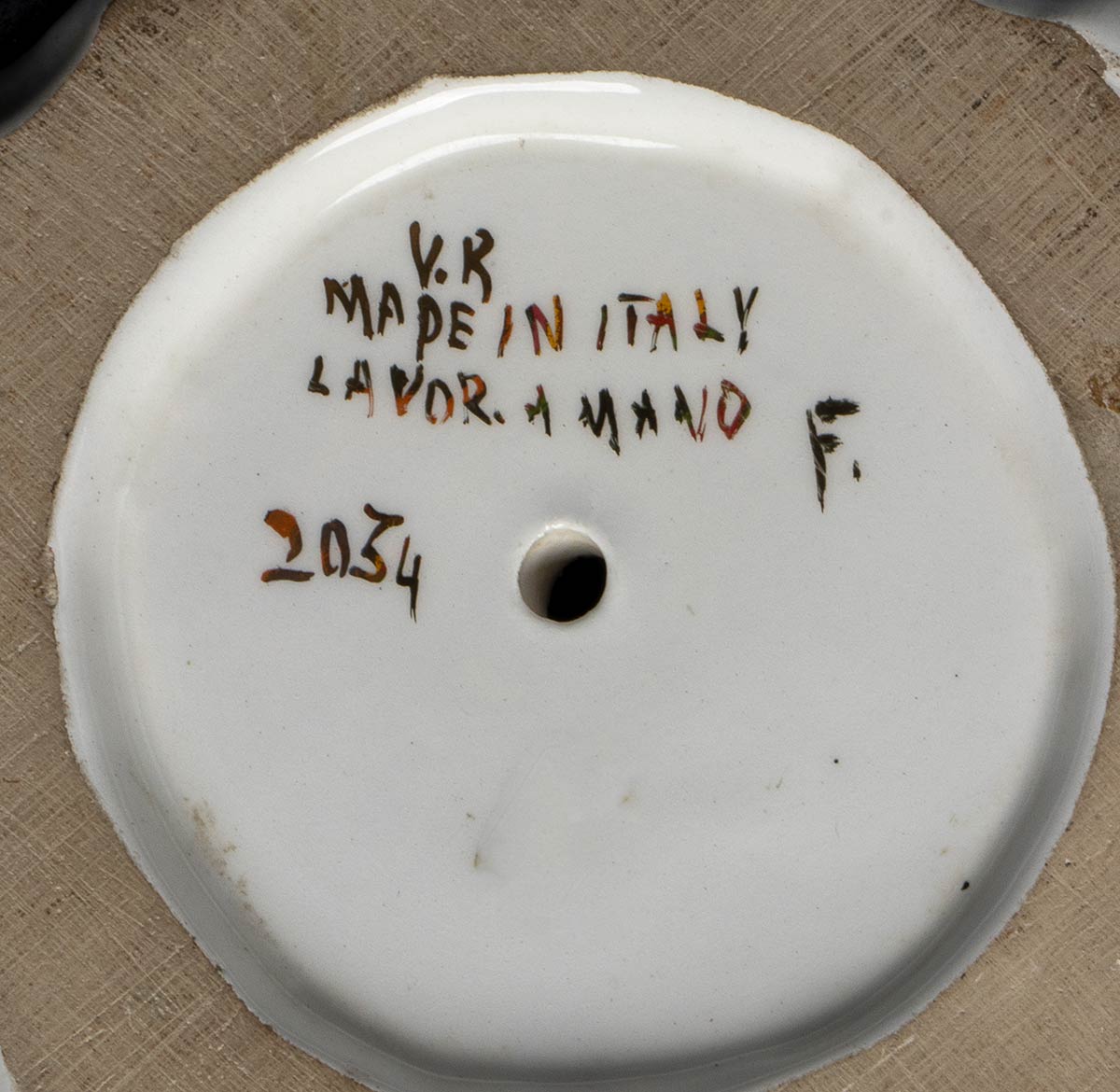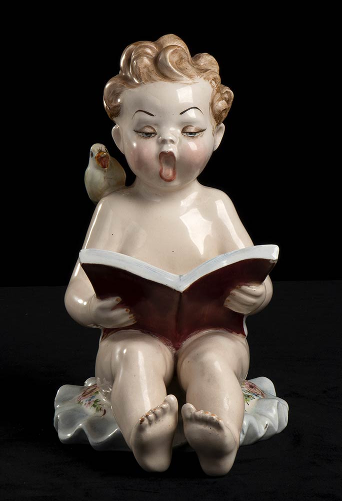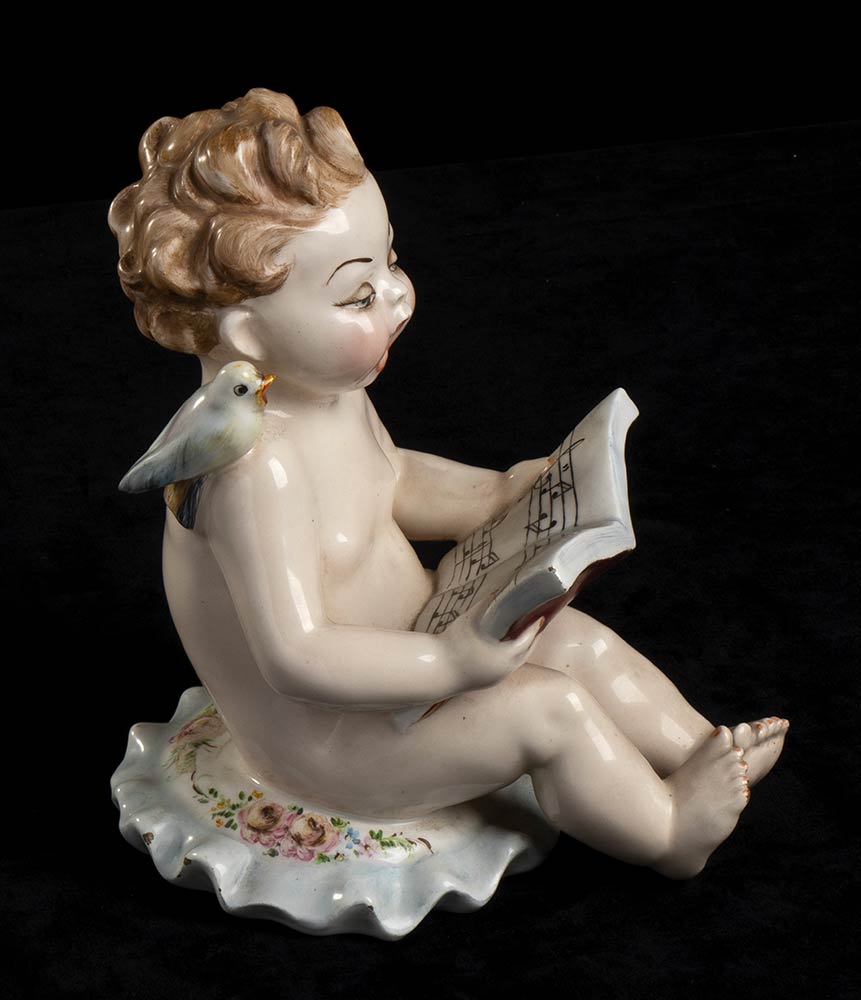Polychrome ceramic sculpture of a sitting boy singing. Marked under the base “VB-Made in Italy-lavor. A mano- n 2034” .