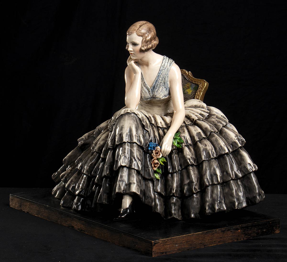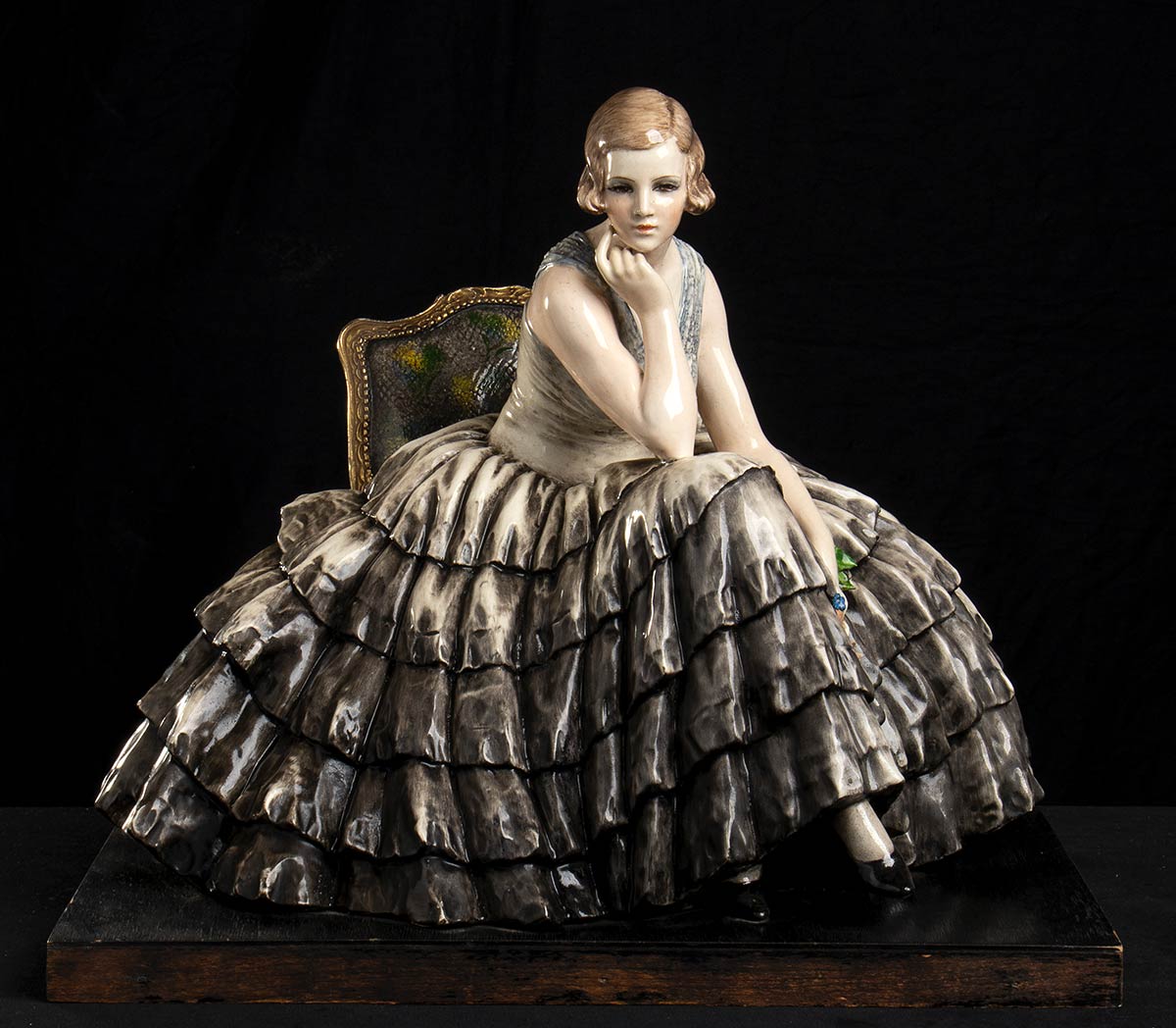 Polichrome gres sculpture of a young lady with a basket flowers. The sculpture is mounted on a wooden base. Signature on the base.