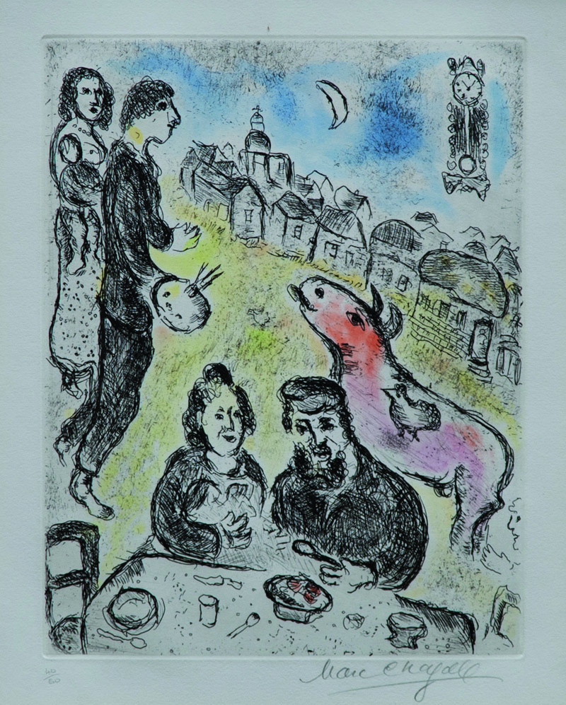Marc Chagall (Liosno 1887 ‑ Saint Paul De Vence 1985) “Le repas” 1980 acquaforte a colori (cm 51,8x37,8) Firmata in basso a destra, numerata in basso a sinistra 40/50. Edizioni Cramer ‑ Geneve ‑ 1981 Provenienza: Galleria dell’Incisione ‑ Milano L’opera è accompagnata da certificato di autenticità su fotografia rilasciato dalla Galleria dell’Incisione