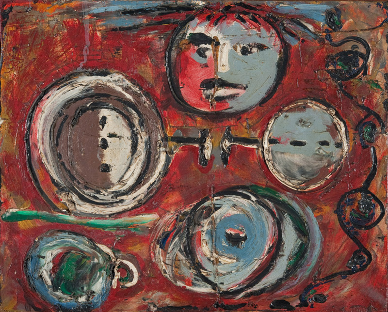 Enrico Baj (Milano 1924 ‑ Vergiate 2003) “Personaggi solari” 1955 olio su tela (cm 40x50) Firmato e datato al retro Bibliografia: E. Crispolti ‑ “Catalogo Generale Bolaffi dell’opera di Enrico Baj “ 1973, pag.137, ill. n. 39