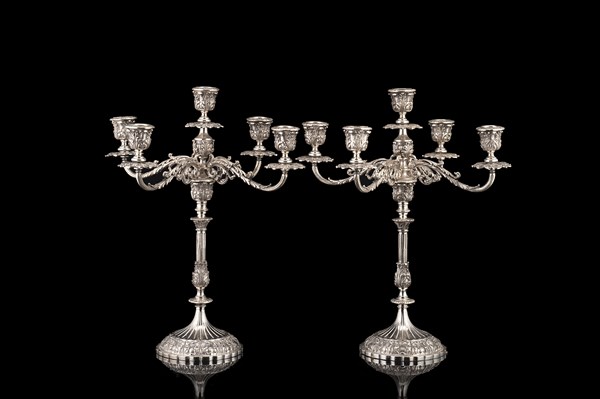 Coppia di candelieri a cinque fiamme in argento cesellato a volute vegetali, fu