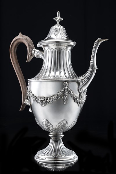 Caffettiera in argento con presa a trottola, corpo cesellato a volute fogliate