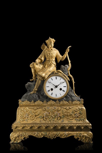 Pendola da tavolo in bronzo dorato e cesellato sormontata da figura di guerriero orientale a tutto tondo