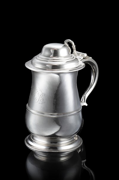 Tankard in argento a corpo liscio e coperchio bombato, monogramma "PE" entro volute. Ansa di forma mossa incisa "I. A." Londra, 1752. Argentiere John Payne (h. cm 20) (g 780 ca.) (lievi difetti)