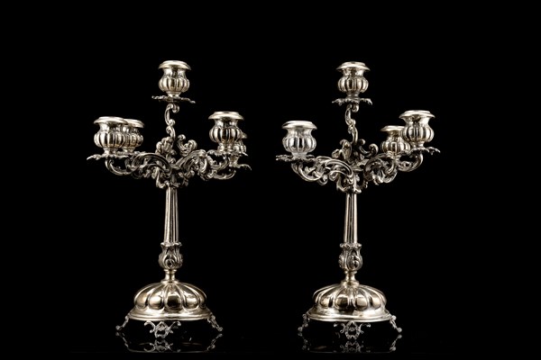 Coppia di candelieri a cinque fiamme in argento con braccia decorate a volute,