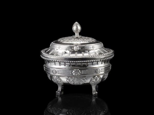 Zuccheriera in argento di forma bombata con presa a pigna, corpo sbalzato e cesellato a medaglioni, perlinature e motivi fogliati. Poggiante su quattro piedi scanalati. Torino. Argentiere Giuseppe Fontana, dal 1787 al 1815 (cm 13x11x8) (piccolo restauro sul bordo)