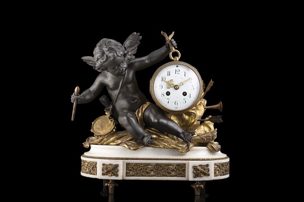 Pendola in marmo bianco, bronzo dorato e patinato con figura di cupido