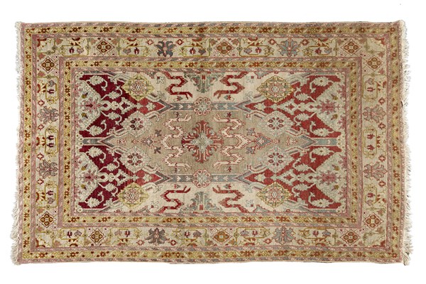 Decoro a doppia nicchia con motivo speculare nei toni del rosso, bianco, azzurro, carta da zucchero, tortora, verde e giallo limone. Interessanti motivi a nuvole. bordura a fondo bianco con motivo Herati molto singolare. (cm 179x119) (lievi difetti)
