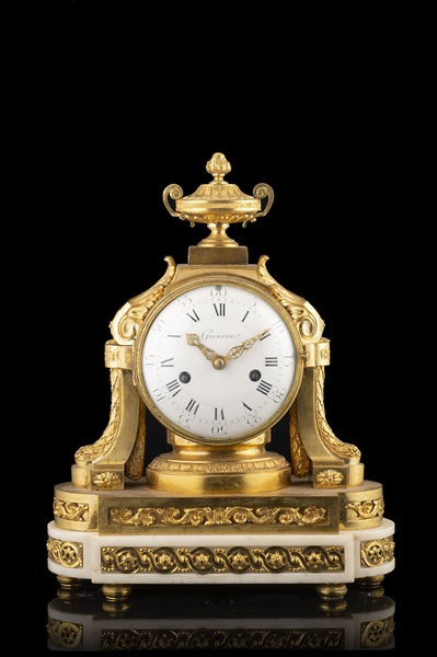 Pendola da appoggio in marmo bianco e bronzo dorato attribuibile a Theodore Guenoux (1744-1800)