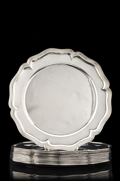 Gruppo di dodici sottopiatti in argento con bordo mistilineo scanalato. Titolo