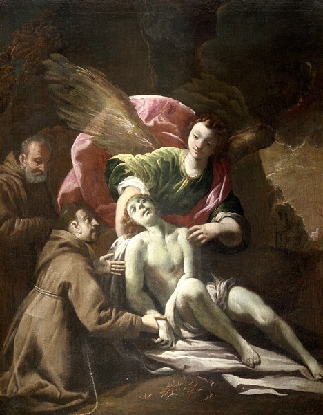 San Francesco e un confratello compiangono Cristo sorretto da un angelo