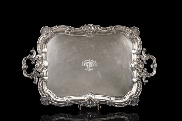 Vassoio biansato in argento con bordi sbalzati a valve di conchiglie e foglie. Anse sagomate, cavetto con monogramma inciso. Vigevano 1850 ca. Argentiere Angelo Giuseppe (l. cm 77) (g 4700 ca.)