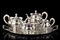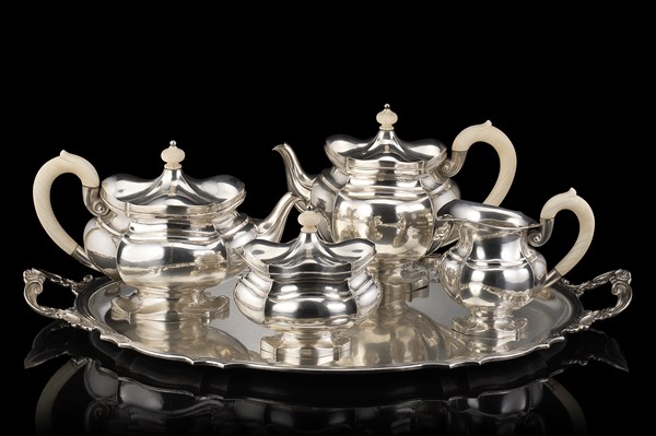 A tea and coffee silver set composed of teapot, coffeepot, milk jug, sugar bowl and tray with ivory handles. Titled 800 (g gross 7000 ca.)