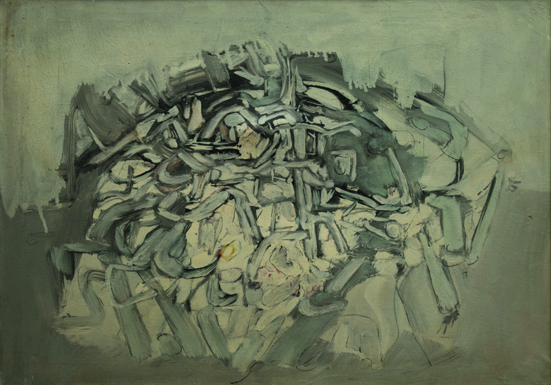 Sergio Dangelo (Milano 1932) “Detriti sulla spiaggia” 1959 olio su tela (cm 70x100) Firmato e datato a destra; firmato, datato 1959 e titolato al retro
