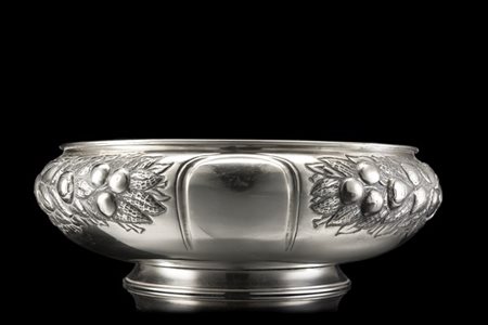 Centrotavola in argento con interno in vermeille e corpo sbalzato a frutti e foglie. Titolo 800 (d. cm 31) (g 990 ca.)