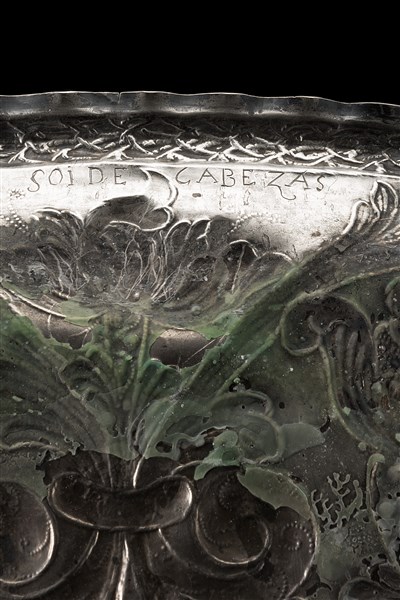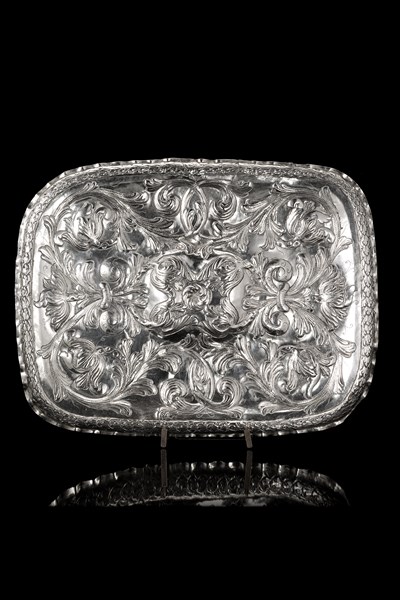 Vassoio di forma rettangolare con bordo sagomato in argento sbalzato e cesellato a volute fogliate. Inciso al retro "Soi de cabezas". Spagna, secolo XVIII (cm 41,5x32,5) (g 715 ca.) (difetti)