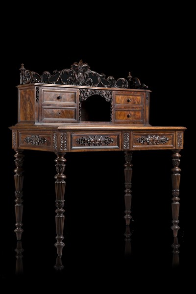 Scrivania da centro in mogano e piuma di mogano. Parte superiore con alzatina a quattro cassetti decorata con ringhiera intagliata e traforata a volute e foglie e parte centrale con vano ad arco. Due cassetti nella fascia intagliati con capitelli a foglie. Gambe scanalate ed intagliate. Liguria, secolo XIX (cm 107x127x63,5) (difetti e mancanze)
