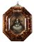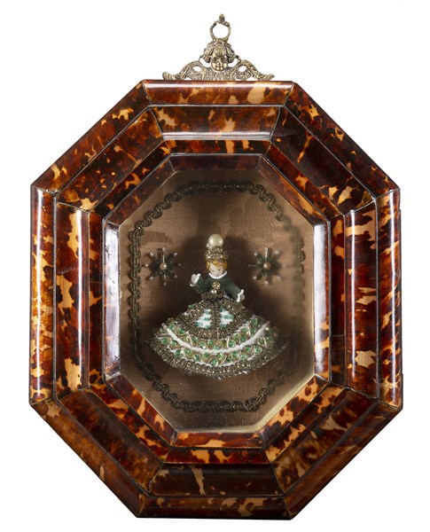 Arte siciliana, secolo XIX. Teca ottagonale lastronata in tartaruga contenente una figura in cera con veste a perline e filo d'oro (teca cm 28x24) (difetti)