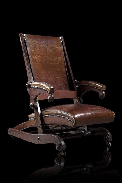 Sedia a sdraio in legno con schienale regolabile, braccioli sagomati con decori tondi in legno tornito. Rivestimento in cuoio con borchie in metallo (difetti e rotture)