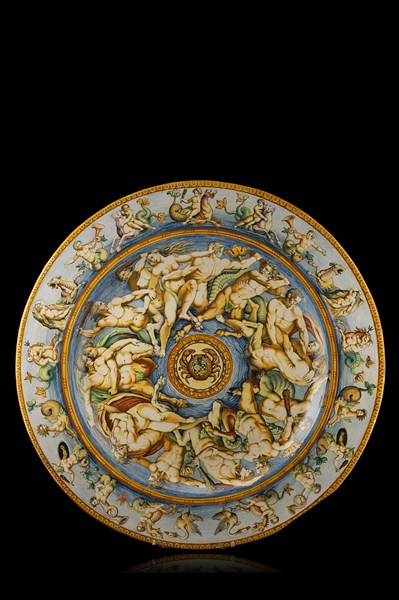 Manifattura del secolo XIX. Piatto in maiolica decorata in policromia a figure mitologiche nel cavetto e nella bordura, al centro granchio e stemma della famiglia Arrighi di Siena (d. cm 56) (lievi difetti)