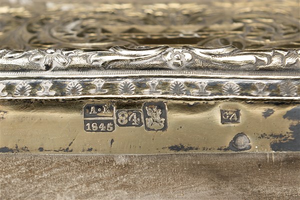 An oil on panel icon representing crucified Christ among saints with Cyrillic inscriptions on the halos. Vermeille riza. Assayer Andrey Antonovich Kovalsky, not identified silversmith. Moscow, mid-19th century (cm 30x35,5) (defects)