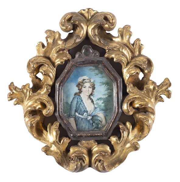 Scuola del secolo XIX "Ritratto di fanciulla in un paesaggio" miniatura su carta (cm 8x6,5) in cornice del secolo XVIII in legno intagliato e dorato (difetti)