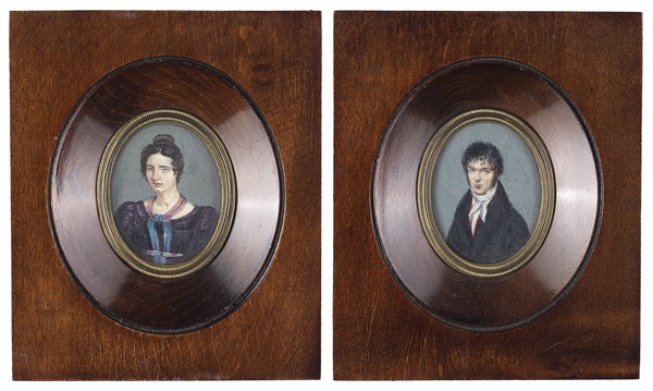 19th-century school of Modena "Portraits of the goldsmith Vincenzi and his spouse (?" a pair of miniatures (cm 5x4) Framed (defects)