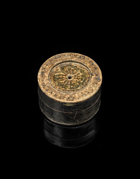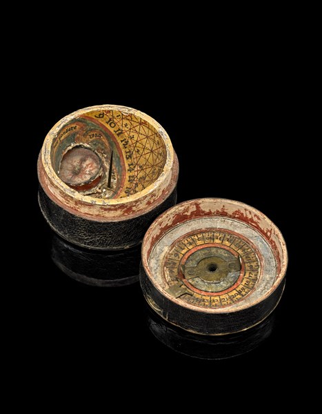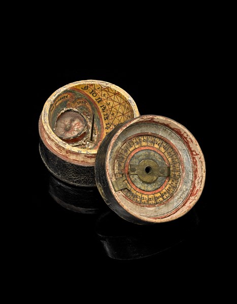 ANONIMO Orologio solare sovrascritto a scafea in cartapesta rivestita in cuoio.