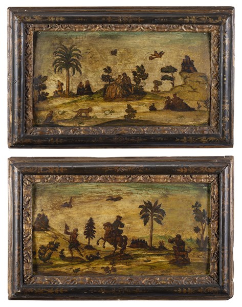 Coppia di pannelli in legno decorati "ad arte povera" a figure in un paesaggio. Secolo XVIII (cm 28x51) in cornici coeve in legno ebanizzato e dorato (difetti)