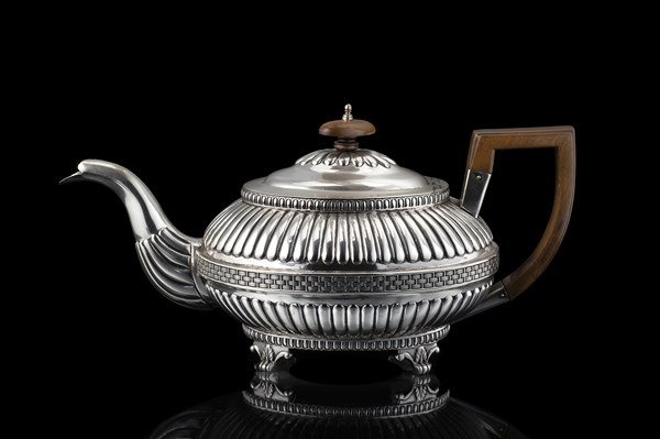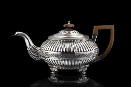Teiera a corpo costolato con fascia incisa a motivo concatenato, ansa e presa in legno tornito e sagomato, piedini mossi. Londra, 1789. Argentiere Charles Hougham (h. cm 13) (g lordi 570 ca.) (lievi difetti)