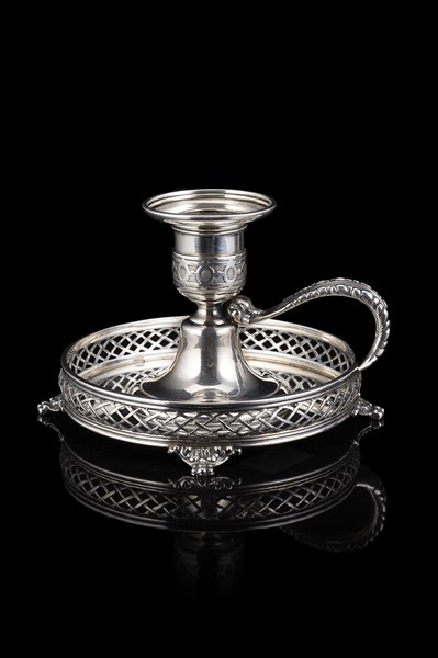 Bugia in argento con bordo traforato a motivi geometrici, ansa e piedini mossi.