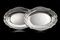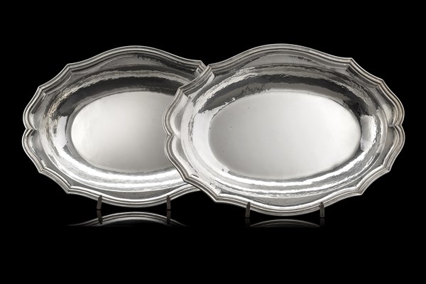 Coppia di centrotavola in argento martellato con bordi sagomati e scanalati. Ti