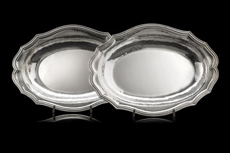 Coppia di centrotavola in argento martellato con bordi sagomati e scanalati. Titolo 800. Verona. Argentiere Tapparini (cm 37x26,5x4,5) (g 1500 ca.)
