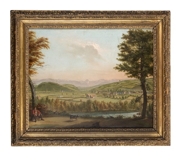 Scuola svizzera, secolo XVIII ' Veduta della vallata di Interlaken con le Alpi sullo sfondo'