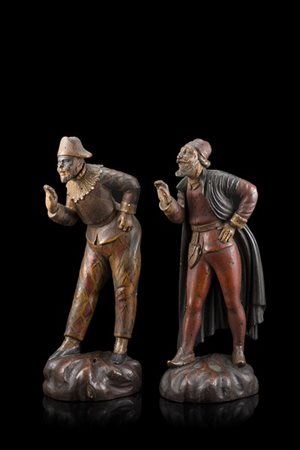 Two lacquered wooden figures of Harlequin and Balanzone. Veneto, 18th century (h. cm 32) (defects)