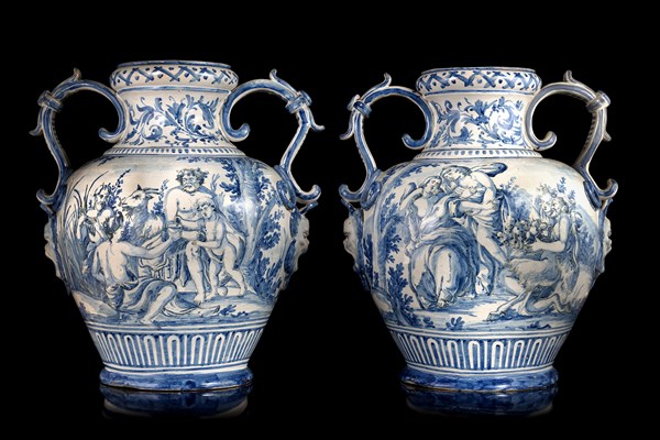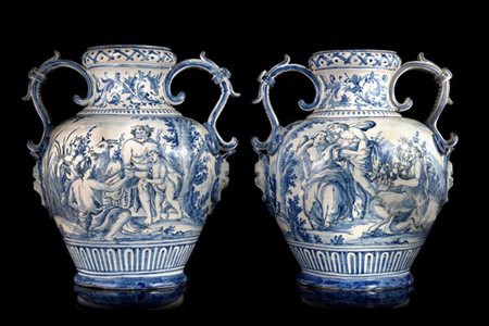 Manifattura ligure, secolo XIX. Coppia di vasi biansati in maiolica decorata in monocromia nei toni del blu a scene classiche con Bacco, Pan e satiro in paesaggi. Anse a volute terminanti a mascheroni. Marchi al retro (h. cm 46) (difetti e restauri)