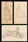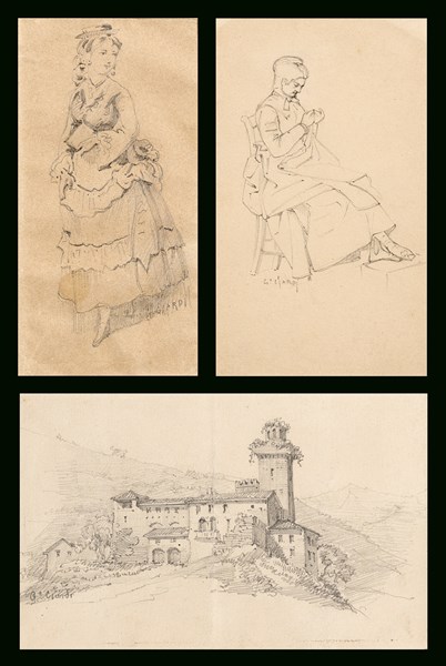 Tre disegni a matita nera in tre cornici, firmati "G. Ciardi": uno raffigurante figura femminile stante (mm 115x58 circa); uno raffigurante figura femminile seduta che cuce (mm 142x84 circa); uno raffigurante castello, con al verso schizzo di paesaggio (mm 88x142 circa) (difetti)