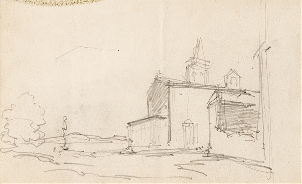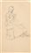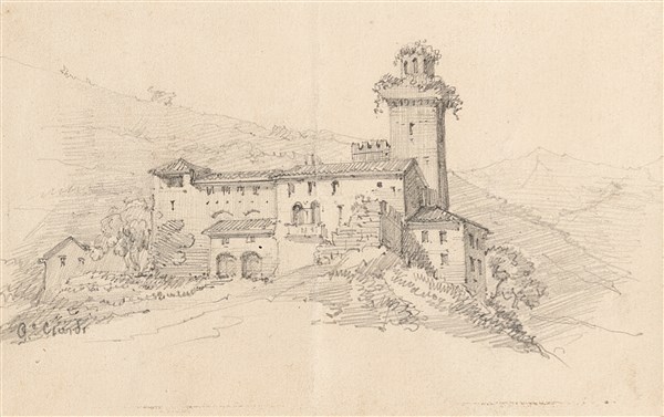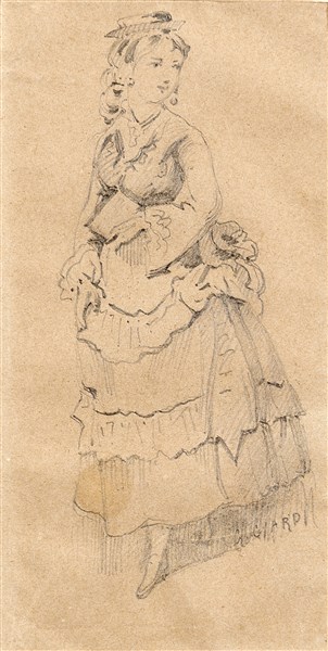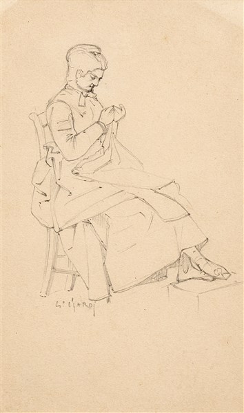 Three drawings in black chalk in three frames, signed "G. Ciardi": one depicting a standing woman (115x58 mm. circa); one depicting a sitting sewing woman (142x84 mm. circa); one depicting a castle (recto) and a sketch for a landscape (verso) (88x142 mm. circa) (defects)