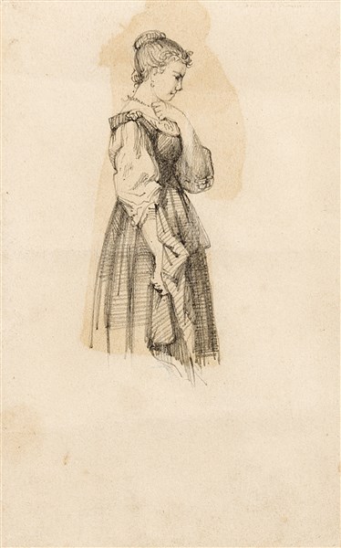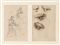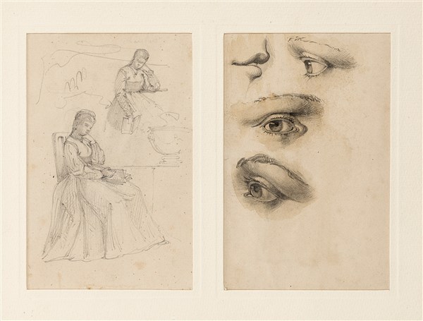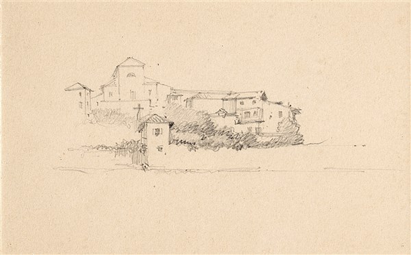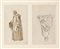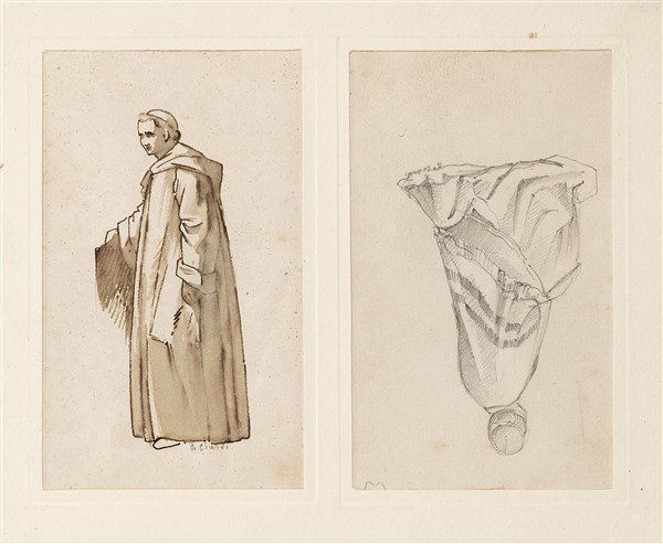 Four drawings in three frames: one in black chalk depicting a view of a village (68x107 mm. circa); one in black chalk depicting view of a village with bridge, signed "G. Ciardi" (recto) and a study for a standing woman (verso) (142x89 mm. circa); one in black chalk depicting studies for a sitting woman (recto) and a study for a female figure (verso) (142x88 mm. circa); the last one in black chalk depicting studies for mouth and eyes (recto) and a standing priest in pen and watercolor signed "G. Ciardi" (verso) (142x88 mm. circa)