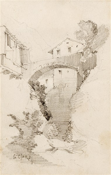 Quattro disegni in tre cornici: uno raffigurante veduta di borgo a matita nera (mm 68x107 circa); uno raffigurante veduta di paese con ponte a matita nera, firmato "G. Ciardi", con al verso studio di figura femminile stante (mm 142x89 circa); uno raffigurante studi di signora seduta a matita nera, con al verso studio di figura femminile (mm 142x88 circa); uno raffigurante studi di occhi e bocca a matita nera, con al verso figura di ecclesiastico stante a penna e acquerello, firmato in basso "G. Ciardi" (mm 142x88 circa)