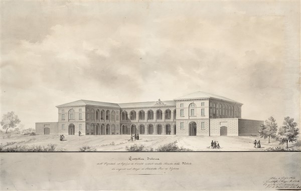Il primo datato e firmato a penna in basso a destra: "Milano 12 Giugno 1844 / Giambattista Chiappa Architetto / ... / ... Accademia di Belle Arti" e iscritto in basso al centro "Prospettiva Interna / dell'Ospitale ed Ospizio di Carità veduto dalla Strada della Vallata / da erigersi nel borgo di Stradella Prov.a di Voghera"
