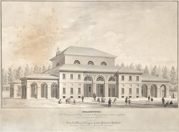 Il secondo iscritto in basso al centro "PROSPETTIVA / dell'Oratorio di S. Luigi ad uso di Congregazione Festiva di Giovani / veduto dal Giardino di Ricreazione / di proprietà / di Sua Eccellenza il Signor Conte Giacomo Mellerio / Consigliere Intimo di Sua Maestà I. R. Apostolica / ed Insignito del Gran Toson d'Oro / ecc. ecc. ecc. "