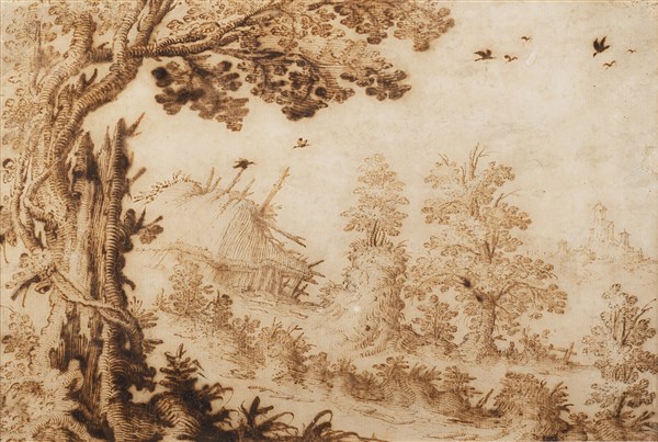 Ercole Bazzicaluva (attr.) Paesaggio con capanna Penna e inchiostro bruno su ca