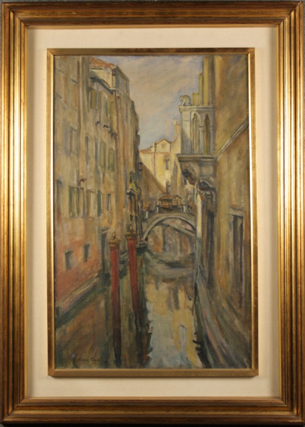 Firmato. SCARPA CROCE LUIGI - Venezia, 1901-1967. Ha partecipato alle mostre di Cà Pesaro e alla Biennale di Venezia. Nel 1930 è stato chiamato quale cunsulente artistico alla I Quadriennale di Roma. Dipinto olio su tela raff. ''CANALE CON PONTE A VENEZIA''. Firmato in basso a sinistra. In cornice. Mis. Lung. cm. 50,5 Alt. cm. 80 ca.