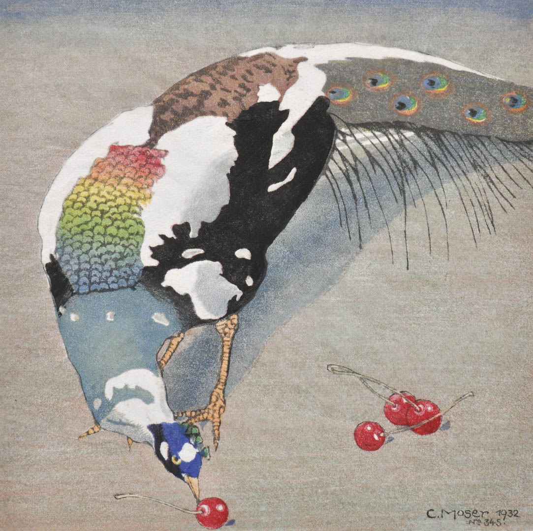 Carl Moser (Bozen/Bolzano 1873 – 1939) Pavone con macchie bianche, 1932;Xilografia a colori, 37 x 37,5 cm