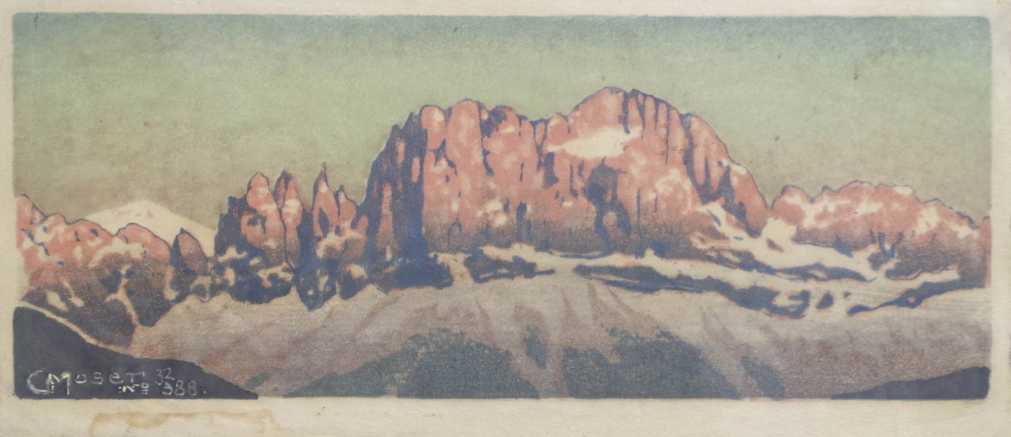Carl Moser (Bozen/Bolzano 1873 – 1939) Catinaccio, 1932;Xilografia a col., 20,5 x 46 cm, macchi sul bordo bianco in basso a sx