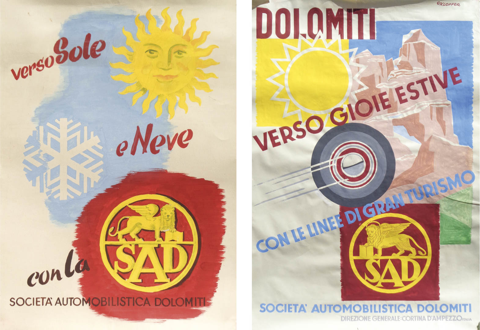 Ernst Klopfer (Frankfurt a. M./Francoforte s. M. 1898 – Bozen/Bolzano 1986) Due bozzetti pubblicitari “SAD – Verso sole e neve”, "Verso gioie estive, Anni '60;Tempera su cartone, 48 x 34 cm