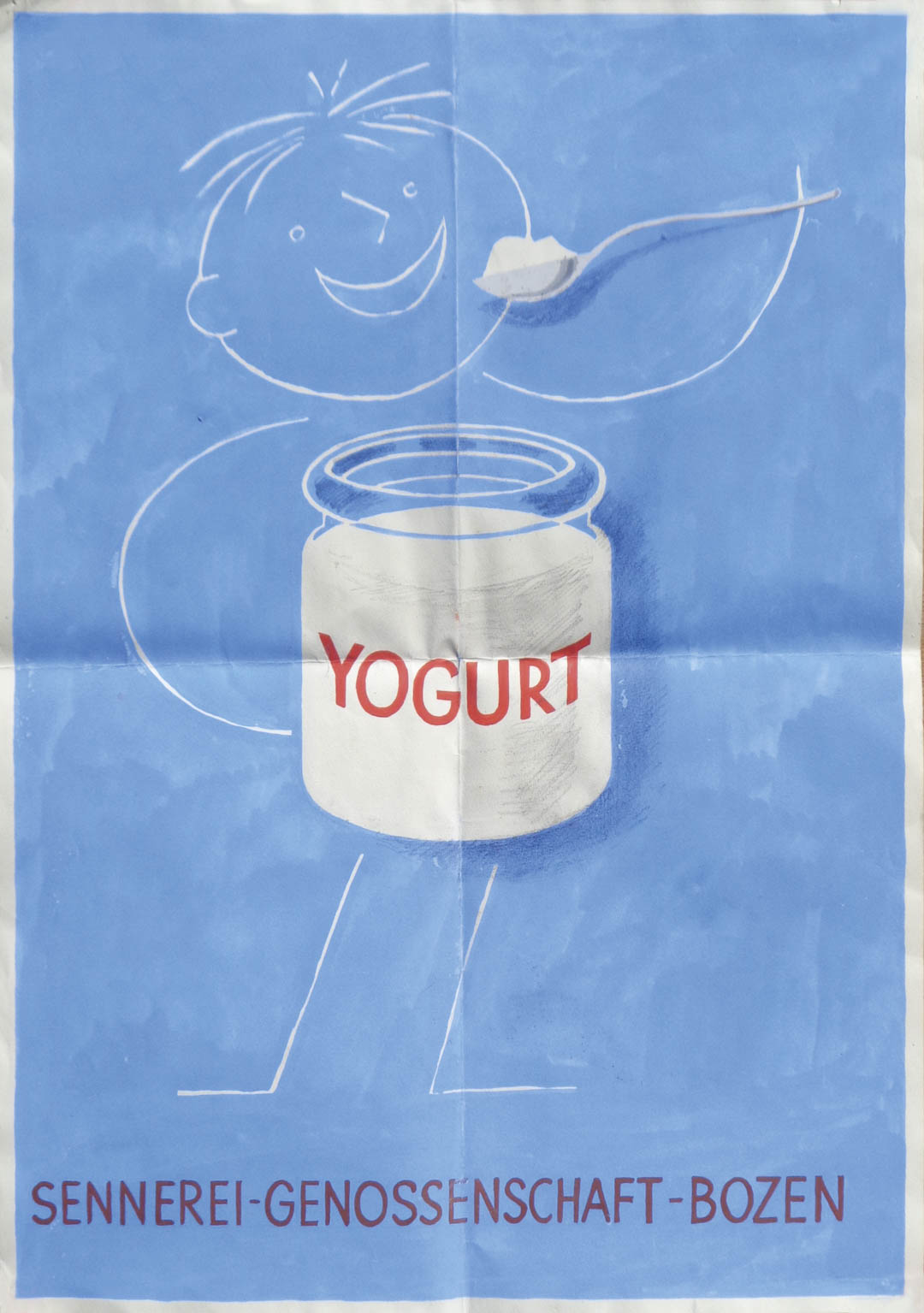 Ernst Klopfer (Frankfurt a. M./Francoforte s. M. 1898 – Bozen/Bolzano 1986) Bozzetto pubblicitario “Sennerei-Genossenschaft Bozen”, Anni ‘60;Tempera e matita su cartone, 58,5 x