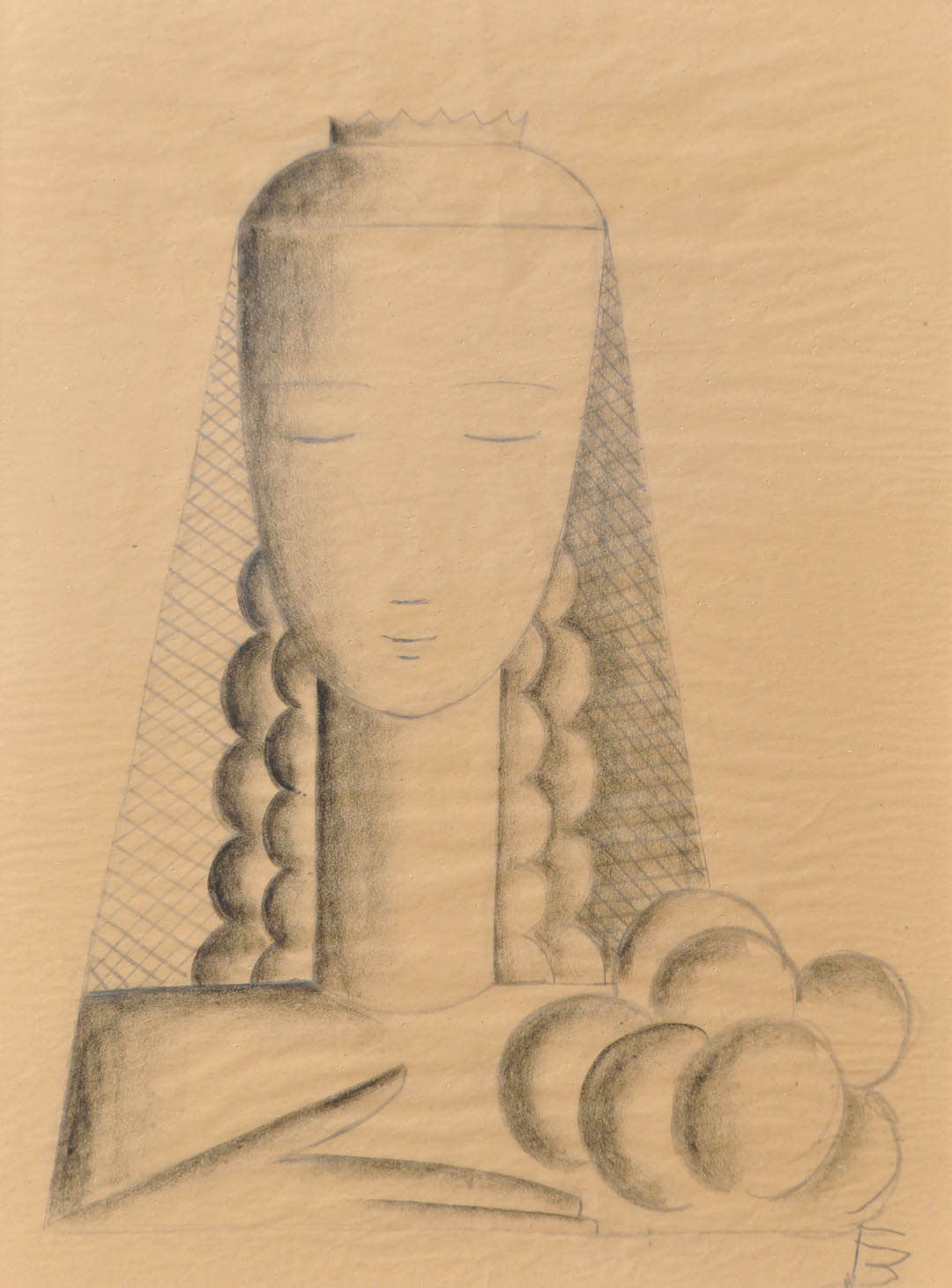 Franz Bacher (Gais 1903 – Bruneck/Brunico 1981) La sposa, Anni `50;Carboncino, 84 x 61,5 cm, minimali buchi nella carta, in cornice